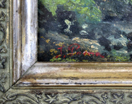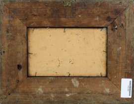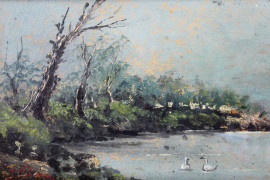 Paesaggio lacustre con cigni, olio su cartone, cm 15x23, firmato, entro cornice