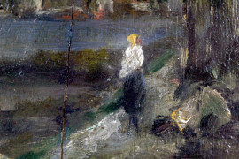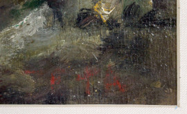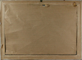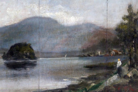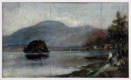 Paesaggio montano con lago, olio su tavoletta, cm 20x32, firma illegibile in basso a destra, entro cornice