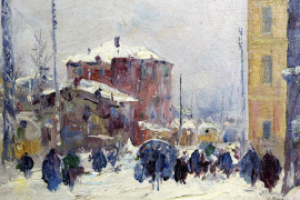 Paese innevato, olio su cartoncino, cm 17x22, firmato e datato, entro cornice