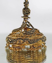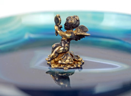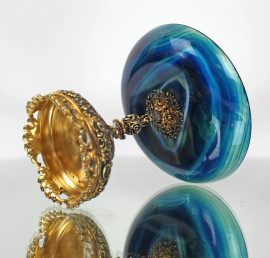 Piccola alzatina in argento dorato, inizi XX secolo, con piatto in agata a sfumature blu e verdi centrato da piccola figura di amorino, fusto di raffinato cesello a foglie intrecciate, base circolare anch’essa cesellata a motivi vegetali, cm 13x10