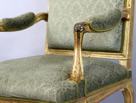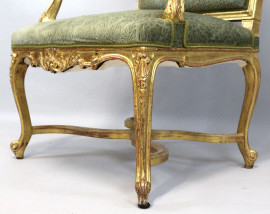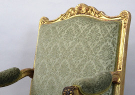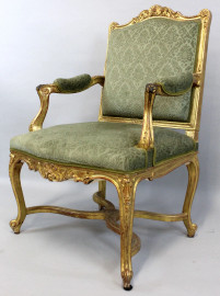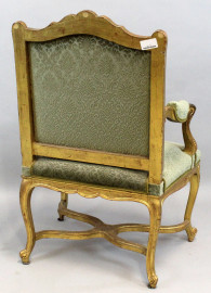 Poltrona in legno intagliato e dorato, XIX secolo, seduta e schienale imbottiti e rivestiti in velluto verde, gambe mosse riunite da crociata, alt. cm 102