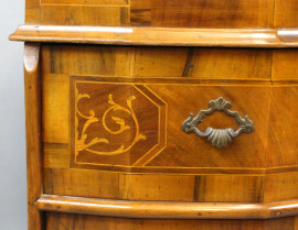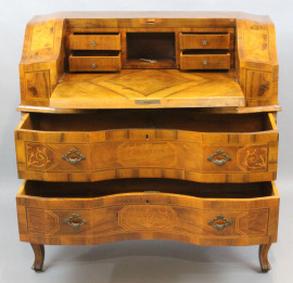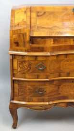 Ribaltina in noce con filettature e particolari intarsiati, fronte mosso a due cassetti e ribalta celante quattro cassettini e vano a giorno, gambe mosse, cm h 87x87x34,5, XX secolo, (difetti)