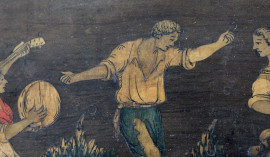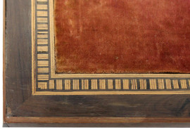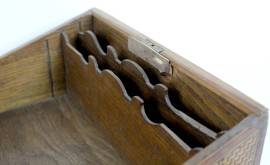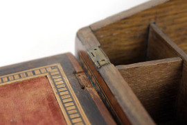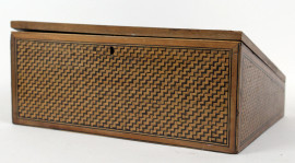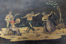 Scatola sorrentina finemente intarsiata in varie essenze, decorazione a micromosaici geometrici, coperchio con grande tarsia raffigurante la Tarantella, XIX secolo, cm h 13,5x24,5x31,5, (difetti)