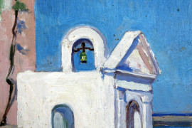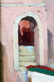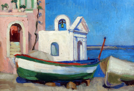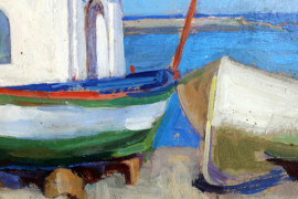 Scorcio con barche, olio su cartone, cm 25x33,5, XX secolo, entro cornice