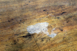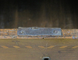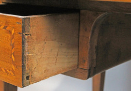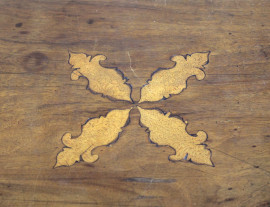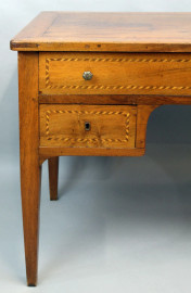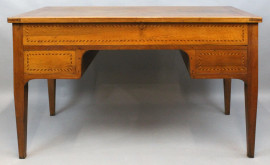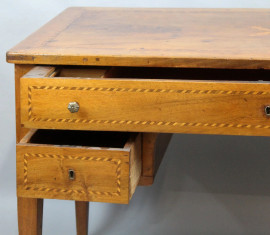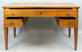 Scrivania in noce del XIX secolo, a tre cassetti, gambe troncopiramidali, particolari intarsiati, cm h 82x132x66, (difetti, segni del tempo)