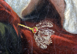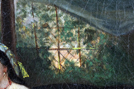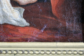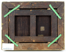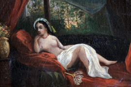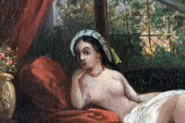 Scuola francese del XIX secolo, Odalisca, olio su tela, cm 15,5x23, entro cornice coeva in legno e stucco dorato