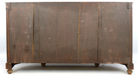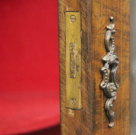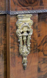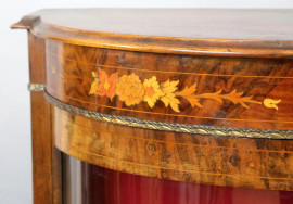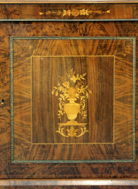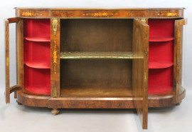 Servante francese, fine XIX secolo, in legno impiallacciato ed intarsiato in varie essenze, fronte ad uno sportello centrale e due laterali a vetri, piedi a cipolla, finiture in bronzo dorato, cm h 100x164x34, (piccoli difetti)
