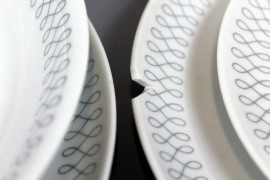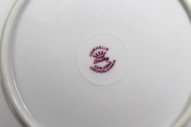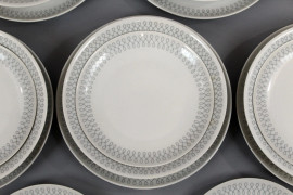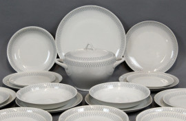 Servizio di piatti in porcellana bianca con decori celesti, composto da: 1 zuppiera, 1 vassoio, 10 piatti piani, 6 piatti fondi, 9 piattini, (difetti)