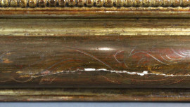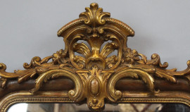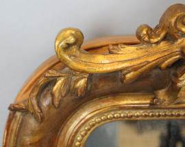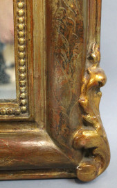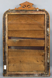 Specchiera in legno intagliato e dorato del XIX secolo, ricca cimasa a volute e foglie, cornice con decori incisi e battuta interna a perlinatura, cm h 112x66, (piccoli difetti)