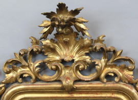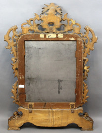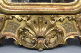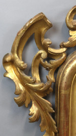 Specchiera in legno intagliato e dorato, fine XVIII-inizi XIX secolo, cornice scolpita a volute e foglie, cm h 144x98