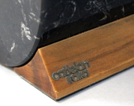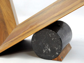 Tavolino Cattelan, piano in cristallo, base in noce e cilindro in marmo, cm h37x130x70, (graffi alla base)