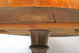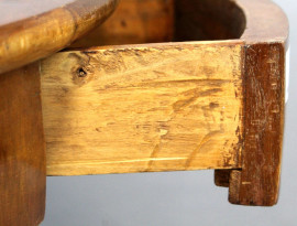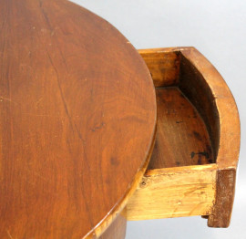 Tavolino di linea circolare in noce, fine XIX secolo, ad un cassetto, gamba centrale a balaustro poggiante su base triangolare, alt. cm 78, diam. cm 87,5, (normali segni del tempo)