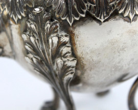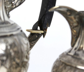 Teiera e lattiera in argento sbalzato e cesellato, manici in legno ebanizzato (uno rotto), zampe leonine, altezza max cm 21, punzoni sotto la base, peso lordo gr. 960