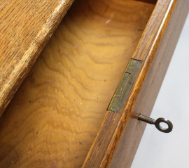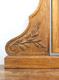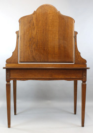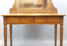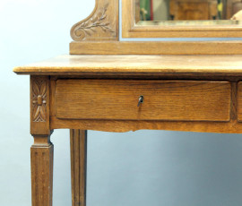 Toilette in rovere con specchiera a psiche, due cassetti sottopiano, quattro gambe troncopiramidali, particolari intagliati, cm h 153x106x59, inizi XX secolo, (difetti)