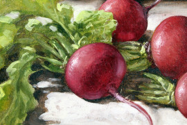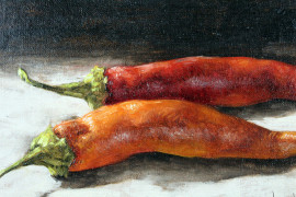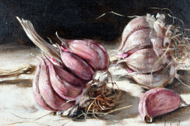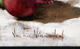 Trittico-peperoncino, aglio e ravanelli, olio su tela riportata su legno, cm 10x17, firmati, entro un'unica cornice