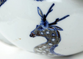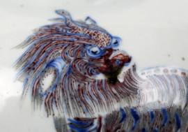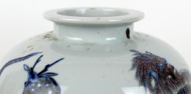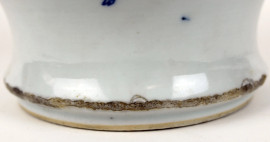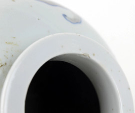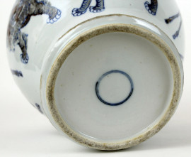Vaso cinese in porcellana bianca con smalti in blu e rosso, decori raffiguranti animali, alt. cm 23, XX secolo, (difetti)