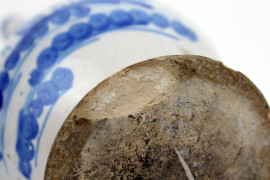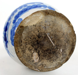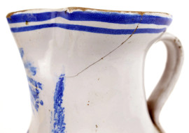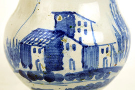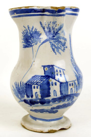 Versatoio in maiolica dipinto in monocromia blu con decoro raffigurante paesaggio, alt. cm 20, XIX secolo, (difetti)