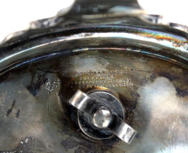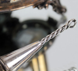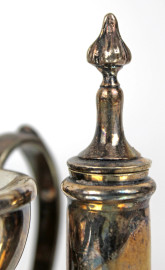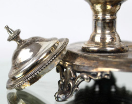 Accendisigari da tavolo in Sheffield con fiamma centrale e stoppini laterali, cm h 14, fine XIX secolo, (mancanze,coperchio non pertinente)