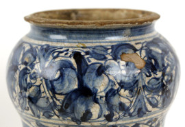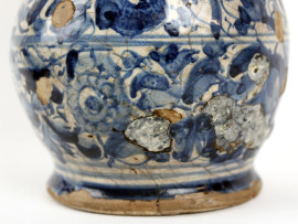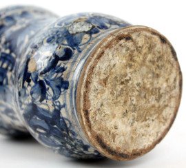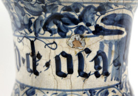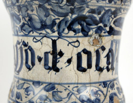 Albarello da farmacia Savona, XVII-XVIII secolo, in maiolica bianco e blu, con iscrizione, cm h 23, (difetti e sbeccature)