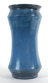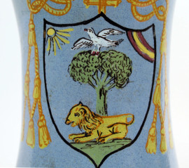 Albarello in ceramica policroma con decoro raffigurante stemma araldico su fondo azzurro, cm 29x14x11, XX secolo, (difetti).
