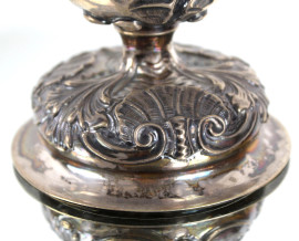 Alzata in argento, interamente sbalzata e cesellata a foglie d'acanto, conchiglie e teste di leone, Argentiere A. Ronchi, cm h 18,5 , gr 569