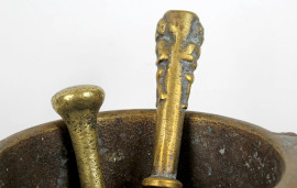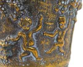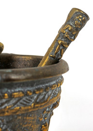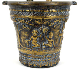 Antico mortaio in bronzo decorato a rilievo con putti, cm h 18