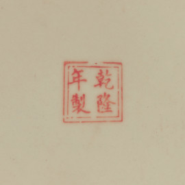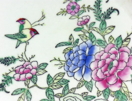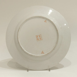 Antico piatto in porcellana cinese, tarda Dinastia Repubblica Popolare Cinese (XX sec.), finemente dipinto a mano, diametro cm 27, al retro marchio dinastico in lacca rossa