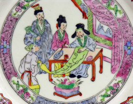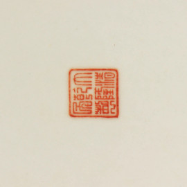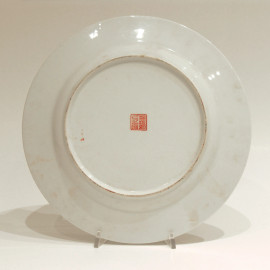 Antico piatto in porcellana cinese, tarda Dinastia Repubblica Popolare Cinese (XX sec.), finemente dipinto a mano, diametro cm 27, al retro marchio dinastico in lacca rossa