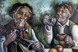 Anziani all'osteria, olio su tela, cm 50x70, firmato M. Liguori, entro cornice