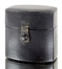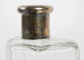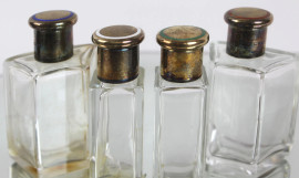Bauletto porta profumi in cuoio blu contenente quattro boccette in vetro con tappi in argento, cm h 12, Mappin & Webb London, prima metà XX secolo, (difetti).