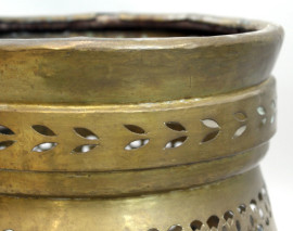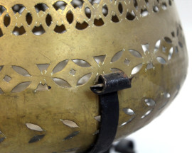 Braciere in metallo dorato e traforato, base a tre piedi in ferro battuto, cm 40x 27, XX secolo.
