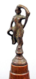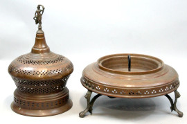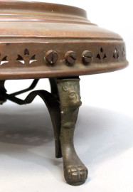 Braciere in rame traforato, campana sormontata da figura femminile, piedi in ferro battuto a zampa ferina, cm h 78, XX secolo.