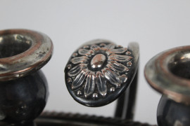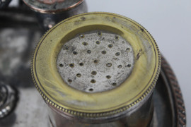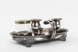 Calamaio in metallo argentato, con due vaschette in vetro, poggiante su quattro piedini ferini, cm h 9x23x17, (difetti e mancanze)