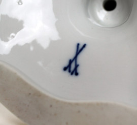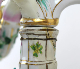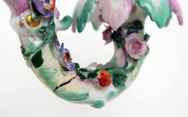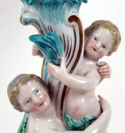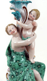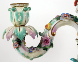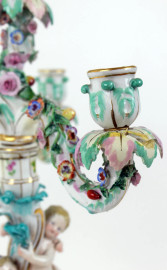 Candelabro in porcellana Meissen a smalti policromi, in due corpi, fusto con figura femminile e putto, cinque braccia con bobèches modellate a forma di corolla, fine XIX - inizio XX secolo, cm h 48, (difetti e restauri)