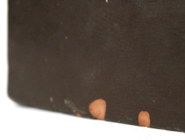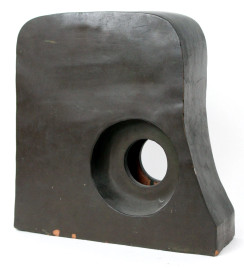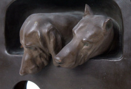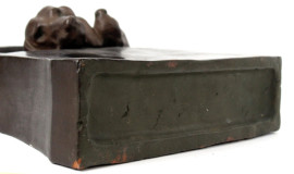 Cassa per orologio in ceramica con teste di cani a rilievo, cm 28x28x8, mancante di meccanica, (difetti).