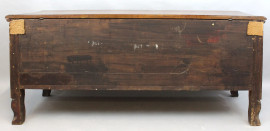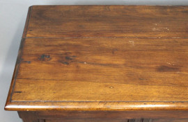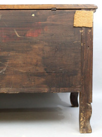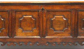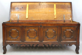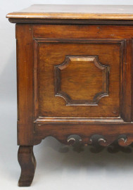 Cassapanca in noce del XIX secolo, fronte pannellato, piano da alzarsi, piedi mossi, cm h 72x165x52