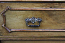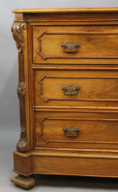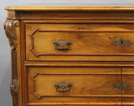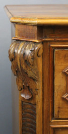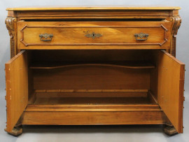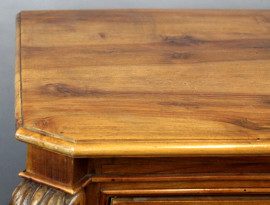 Cassettone in noce, inizi XX secolo, ad un cassetto e due sportelli modanati a formelle, piano con spigoli scontornati e lesene scolpite a foglie d'acanto, cm h 100x130x58, (difetti)