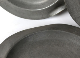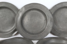 Cinque piatti in peltro con particolari incisi, diametro cm 24,5