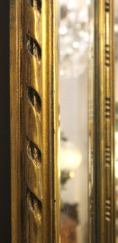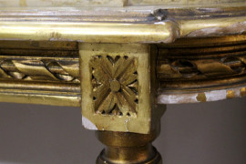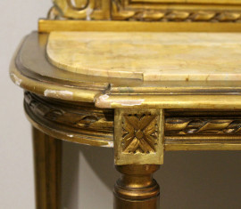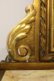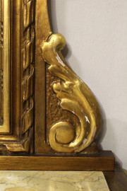 Consolle con specchiera stile Luigi XVI, in legno intagliato e dorato, cimasa scolpita a decori floreali con riserva rivestita in tappezzeria, piano in marmo giallo di Siena, gambe scanalate legate da crociata, cm 270x122x47, XX secolo, (piccoli difetti)