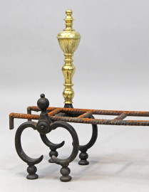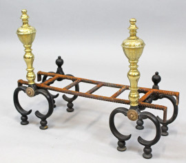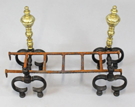 Coppia di alari da camino in ferro battuto e bronzo dorato, particolari incisi, cm h 38, XX secolo.
