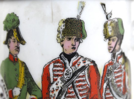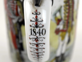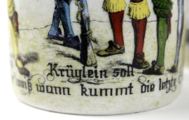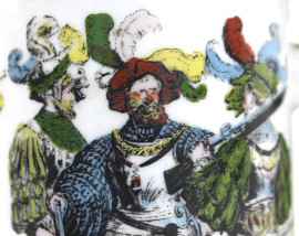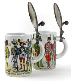 Coppia di boccali in ceramica policroma raffiguranti soldati e figure in costume, coperchi in peltro, cm h 14, XX secolo.