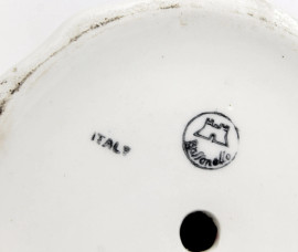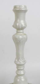 Coppia di candelieri in ceramica Bassanello, XX secolo, fusto a balaustro, base mistilinea, cm h 27