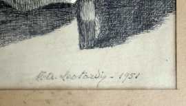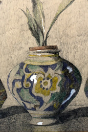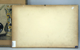 Coppia di nature morte con vasellame, tecnica mista su carta, cm 27,5x47,5, firmate e datate V.A.Leotardi 1951, entro cornici.