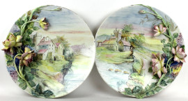 Coppia di piatti in maiolica dipinta raffiguranti paesaggi con fiori a rilievo, Francia, inizi XX secolo, diam. cm 47