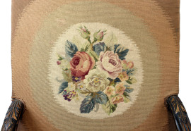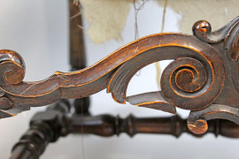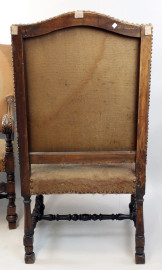 Coppia di poltrone in noce, schienale sagomato, braccioli a giorno desinenti a ricciolo, gambe tornite riunite da traversa, cm h 119