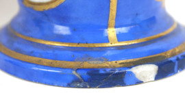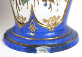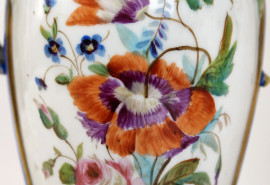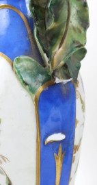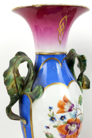 Coppia di vasi Luigi Filippo in porcellana policroma, decoro a motivi floreali e prese a foglia, altezza cm 32 , (difetti e restauri).