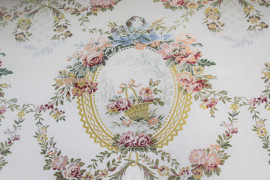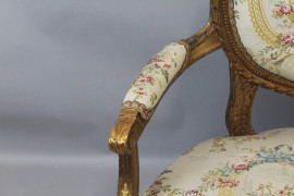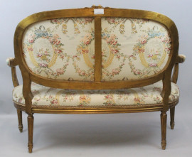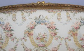 Divano stile Luigi XVI in legno intagliato e dorato, tappezzeria a fiori e festoni, cm 97x125x58, XX secolo.