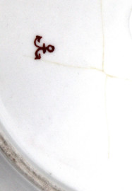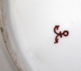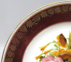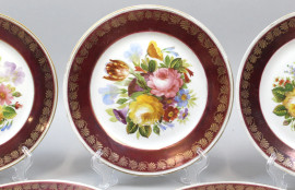 Dodici piatti piani in porcellana policroma a decori floreali, finiture dorate su tesa bordeaux, diametro cm 25, marchio sotto la base