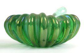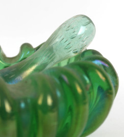 Due mortai con pestello in vetro di Murano verde con bordo costolato, cm 6x13x16,(difetti).