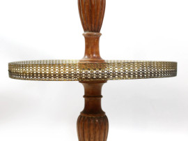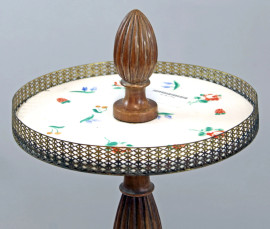 Étagere a tre piani in porcellana policroma con struttura in noce e ringhierine in metallo dorato, cm h 103, XX secolo, (difetti).